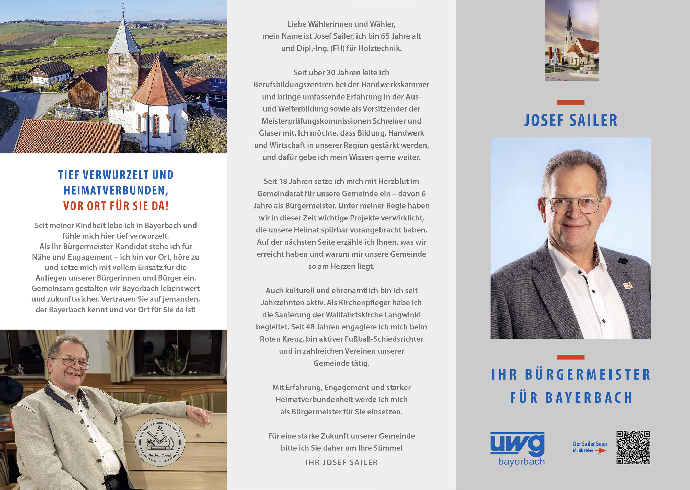 Lernen Sie unsere UWG-Kandidaten für Bayerbach sowie unseren Bürgermeisterkandidaten Josef Sailer persönlich kennen. Außerdem stellen wir Ihnen auch regionale UWG-Kreistagskandidaten vor.